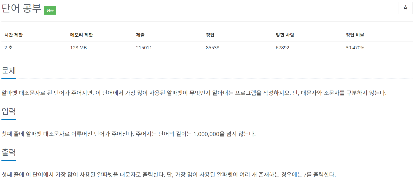 간단하게 해석하자면 한 단어를 입력받고 그 단어에 대해서 가장 많이 사용된 알파벳을 구하는 문제이다.