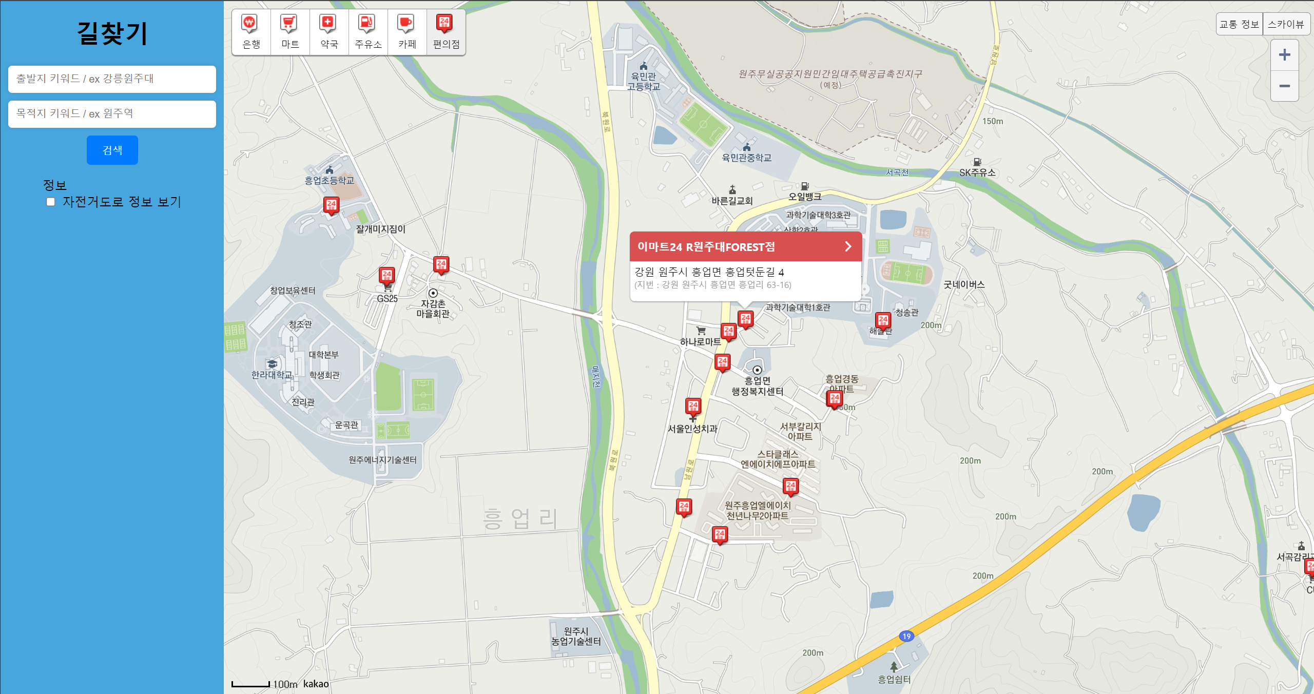 또한 지도에 표시된 마커들을 클릭하게 되면 해당 편의 시설의 이름과 위치를 보여준다.