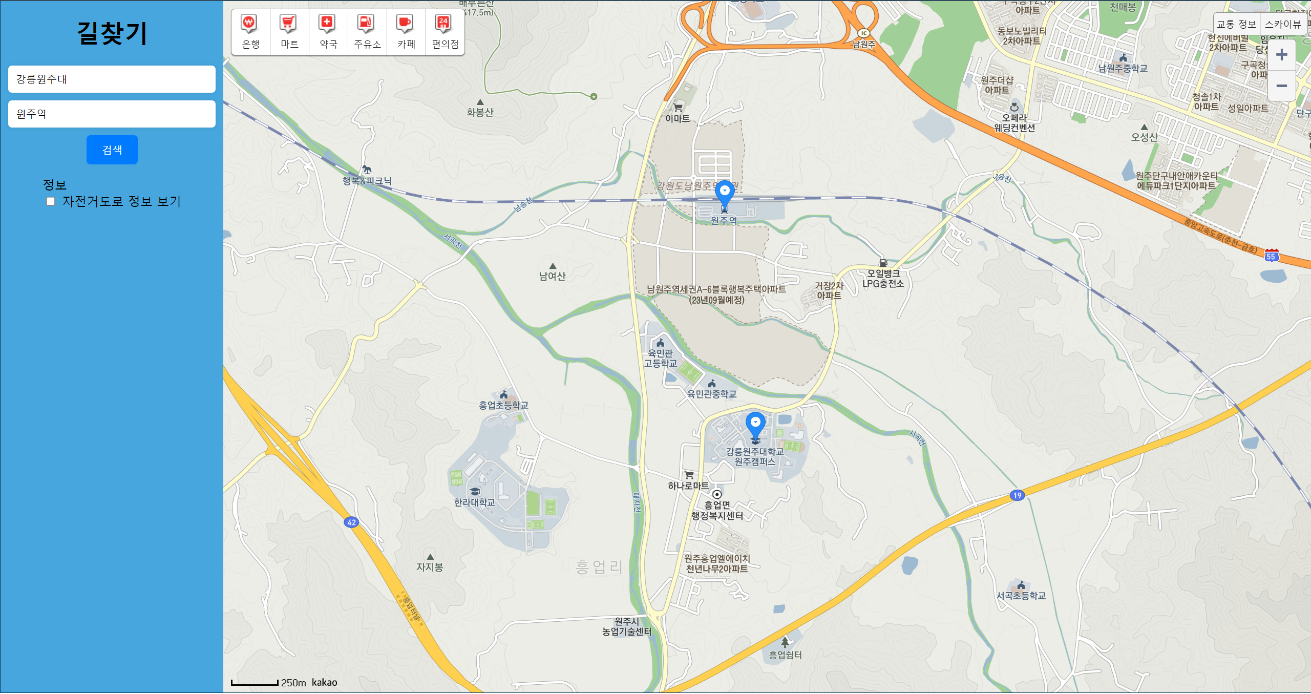 위 사진은 카카오 맵 API를 이용하여 실제 지도를 불러온 초기 화면이다. 초기 지도 좌표 값으로 강릉원주대 원주캠퍼스를 기점으로 넣었다.